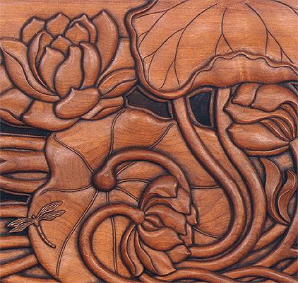 Detail: Eve Lotus Bed Headboard Design: by Lee Birch Wood: Michelia champaca Headboard measurements: Height: 21” x Width: 78” x Depth: 2”